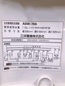 日立にてサンヨーの全自動洗濯機2007年製のASW-70Aを出張買取いたしました