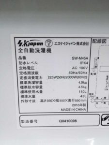 那珂にてS.K japanの全自動洗濯機のSW-M45Aの2016年製を出張買取いたしました