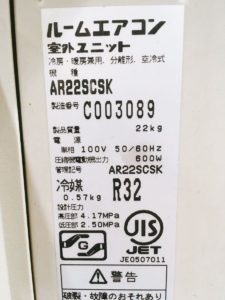 DAIKIN ダイキン ルームエアコン 主に8畳用 単相1000V 冷媒R32 AN22SCSK AR22SCSK 2015年製